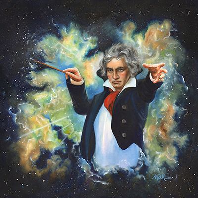 This painting imagines Beethoven conducting an etheric orchestra, his hands guiding the stars and planets in a grand, celestial performance. Beethoven himself is depicted at the heart of this cosmic arrangement, his being radiating with the energy and intensity that characterized both his music and his persona.